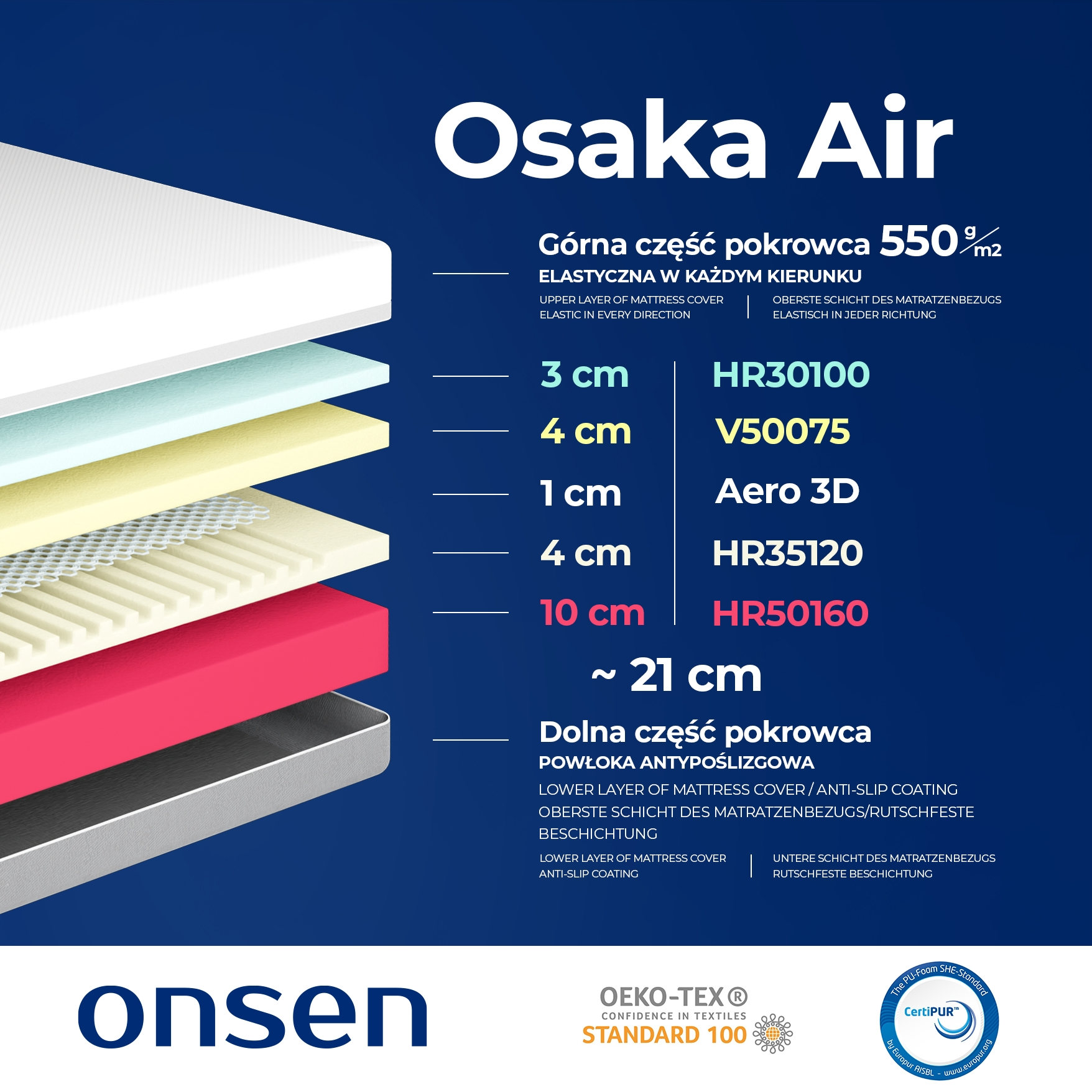 ONSEN® als einziger Hersteller hat ein innovatives Belüftungssystem eingeführt, das Feuchtigkeit und überschüssige Wärme aus dem Inneren der Matratze abführt. Dies bewirkt, dass die funktionelle Schaummatratze Osaka Air das Problem der Überhitzung löst und das Schwitzen während des Schlafes deutlich reduziert.