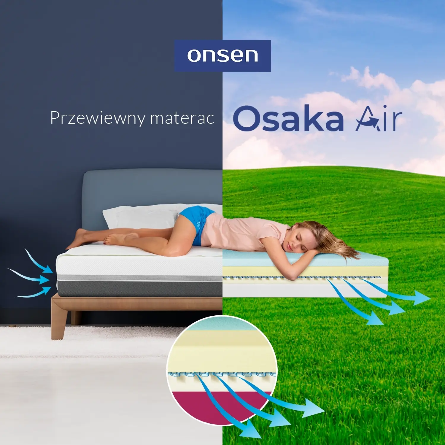 ONSEN® as the only manufacturer has implemented an innovative ventilation system that removes moisture and excess heat from inside the mattress. This means that the functional foam mattress Osaka Air solves the problem of overheating and significantly reduces sweating during sleep.